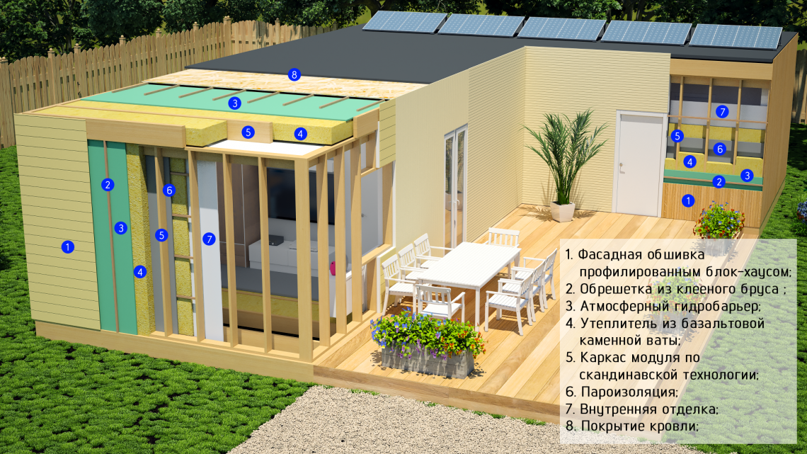 Модули, производимые ООО «Модульный Дом» изготавливаются из экологически чистых материалов: деревянного клееного бруса, блок-хауса, обработанные БИО-пропитками и красками на водной основе фирмы «Адлер», базальтовая каменная вата.